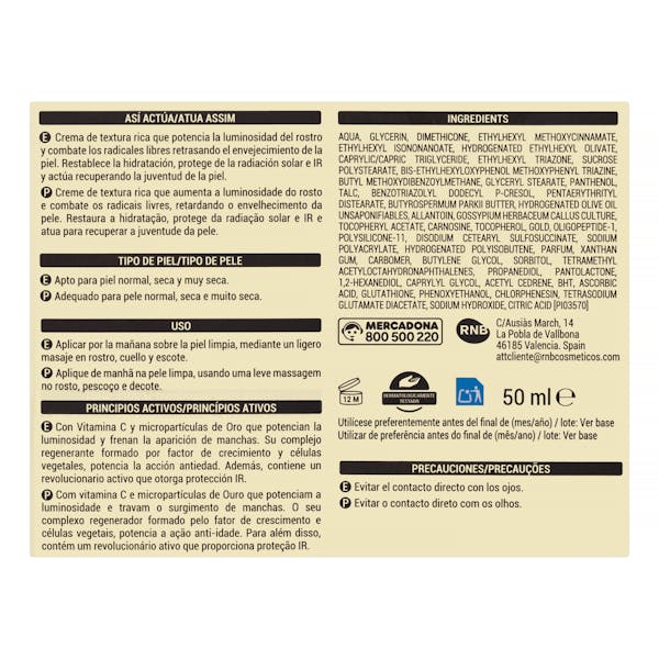 Aqua, Octocrylene, Dimethicone, Glycerin, Ethylhexyl Isononanoate, Butyl Methoxydibenzoylmethane, Hydrogenated Ethylhexyl Olivate, Caprylic/Capric Triglyceride, Sucrose Polystearate, Glyceryl Stearate, Panthenol, Talc, Ethylhexyl Triazone, Pentaerythrityl Distearate, Butyrospermum Parkii Butter, Hydrogenated Olive Oil Unsaponifiables, Allantoin, Gossypium Herbaceum Callus Culture, Tocopheryl Acetate, Carnosine, Tocopherol, Oligopeptide-1, Polysilicone-11, Disodium Cetearyl Sulfosuccinate, Sodium Polyacrylate, Hydrogenated Polyisobutene, Hydroxyacetophenone, 1,2-Hexanediol, Caprylyl Glycol, Parfum, Xanthan Gum, Carbomer, Butylene Glycol, Sorbitol, Propanediol, Pantolactone, Ascorbic Acid, Colloidal Gold, Glutathione, Disodium EDTA, Sodium Hydroxide, Citric Acid.