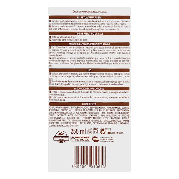 Aqua; Propanediol; Butylenglykol; Isopentyldiol; Niacinamid; Natriumascorbylphosphat; Vaccinium Myrtillus Fruchtextrakt; Saccharum Officinarum Extrakt; Citrus Aurantium Dulcis Fruchtextrakt; Citrus Limon Fruchtextrakt; Acer Saccharum Extrakt; PPG-26-Buteth-26; PEG-40 hydriertes Rizinusöl; Hydroxyethylcellulose; Parfum; Glycerin; Phenoxyethanol; Tetranatriumglutamatdiacetat; Chlorphenesin; Milchsäure; Cetrimoniumbromid; Limonen; Natriumhydroxid